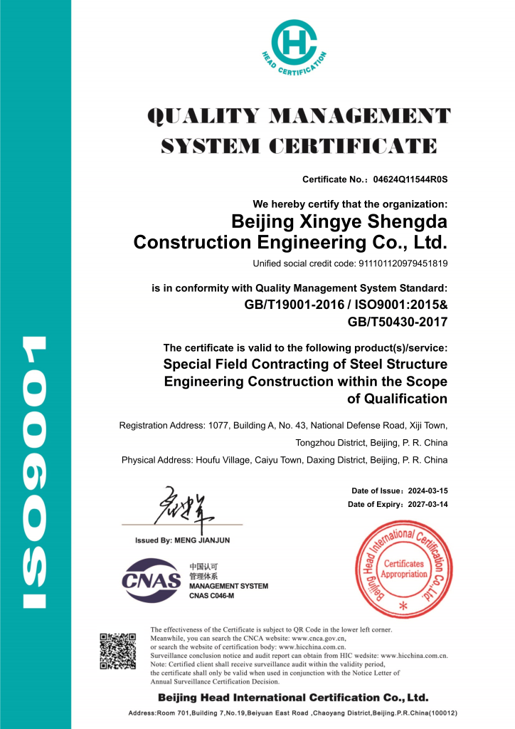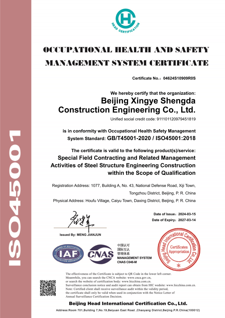 - It holds a number of qualification certificates issued by national authorities, including the Qualification for Professional Contracting of Steel Structure Engineering and the Work Safety License.